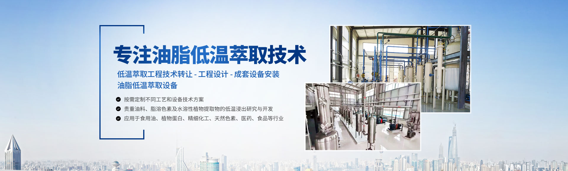 行業經驗豐富,致力于低溫萃取工程技術轉讓、工程設計、成套設備安裝的企業。